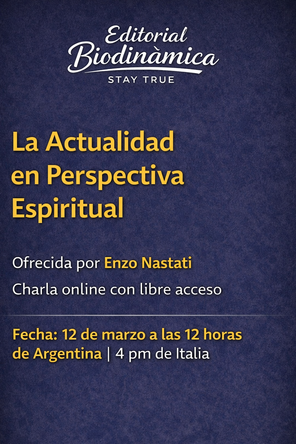 La charla estará a cargo de Enzo Nastati, reconocido investigador y conferencista en el ámbito de la antroposofía, la agricultura devocional y la ciencia espiritual.
